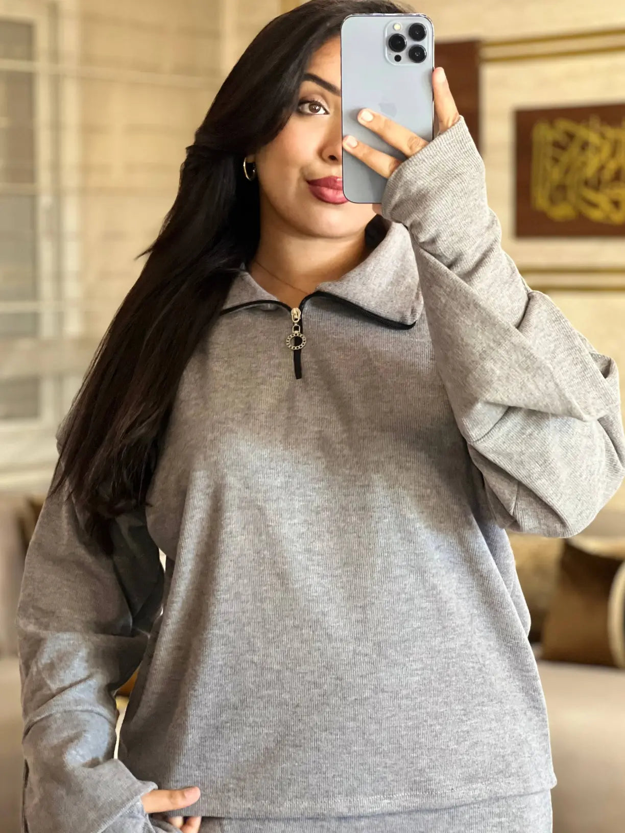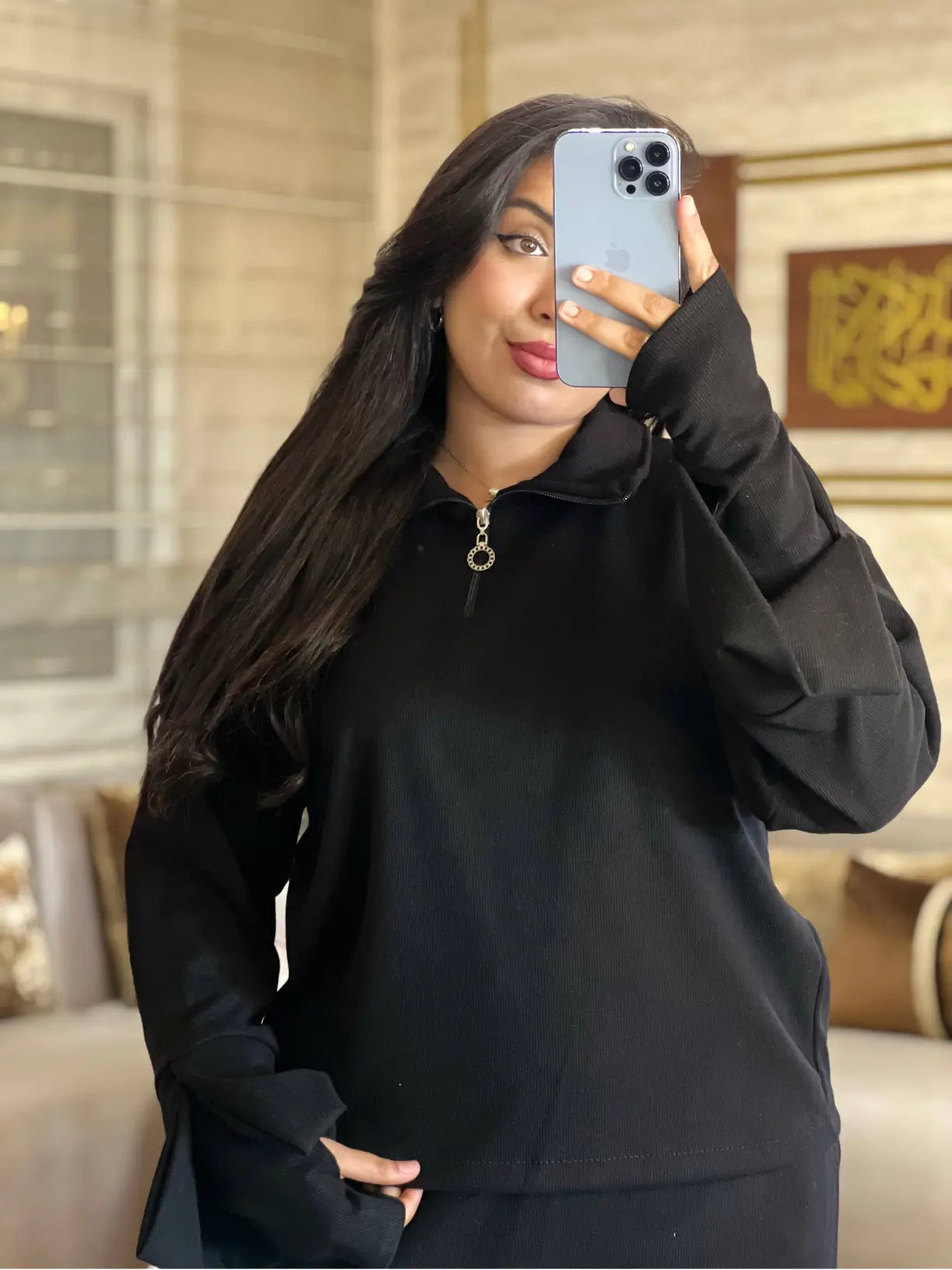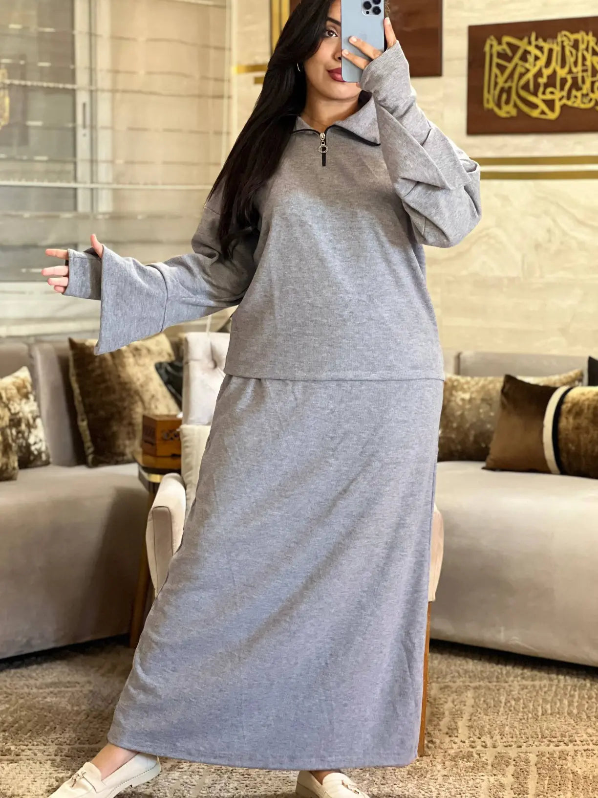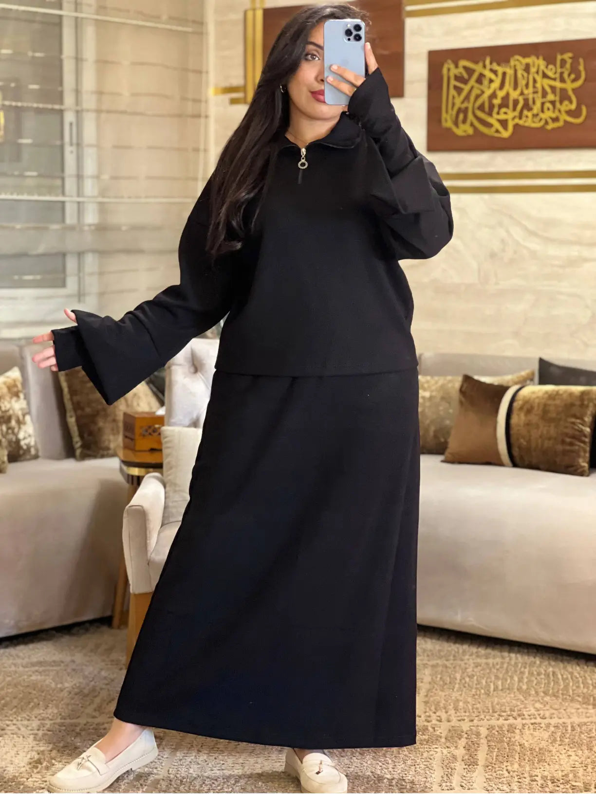 أونصومبل 3 قطع (صاية، سورفيت، وأكمام عصرية) كيجمع بين الحشمة والأناقة. موديل "Oversized" كيجيك طايح ومريح في اللبسة، كيعطيك هيبة وفخامة فين ما مشيتي